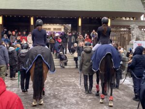 毎年元旦には馬術部所属2騎が、厩舎より10km離れた地域の神社へ参拝する恒例行事です。